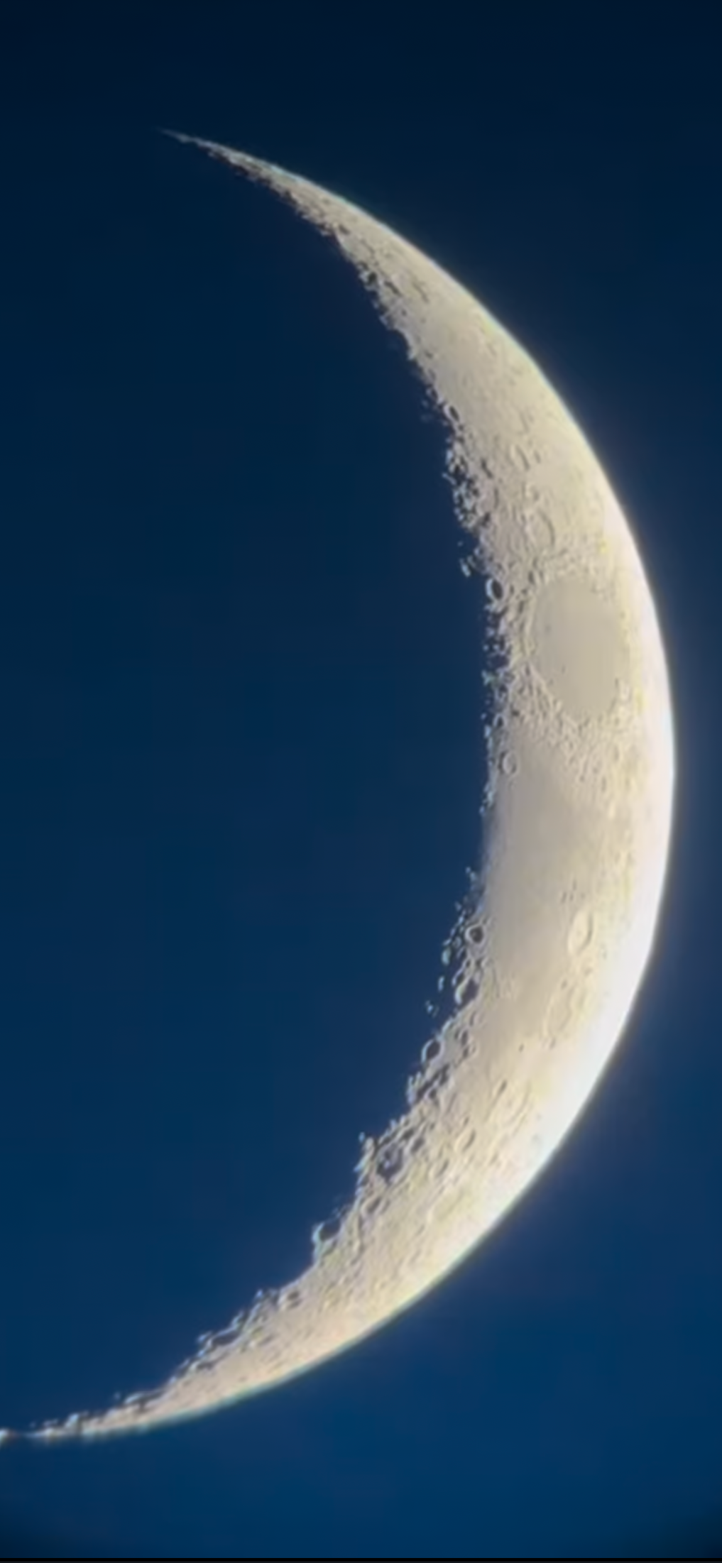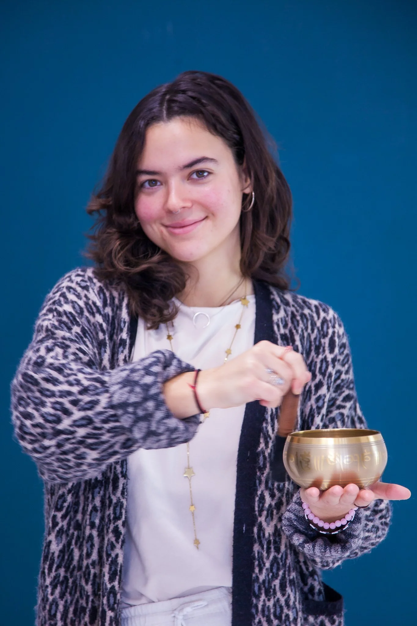 Founder of Evolve, Steph, with a Sacral Chakra Singing Bowl, alongside a waxing crescent moon.